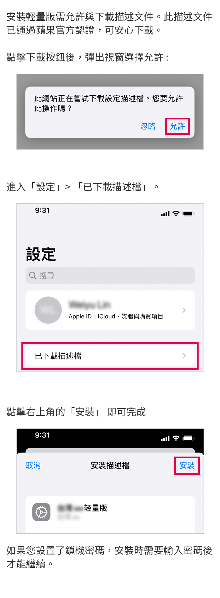 設定 > 一般 > VPN與裝置管理 > 已下載描述檔 > 安裝